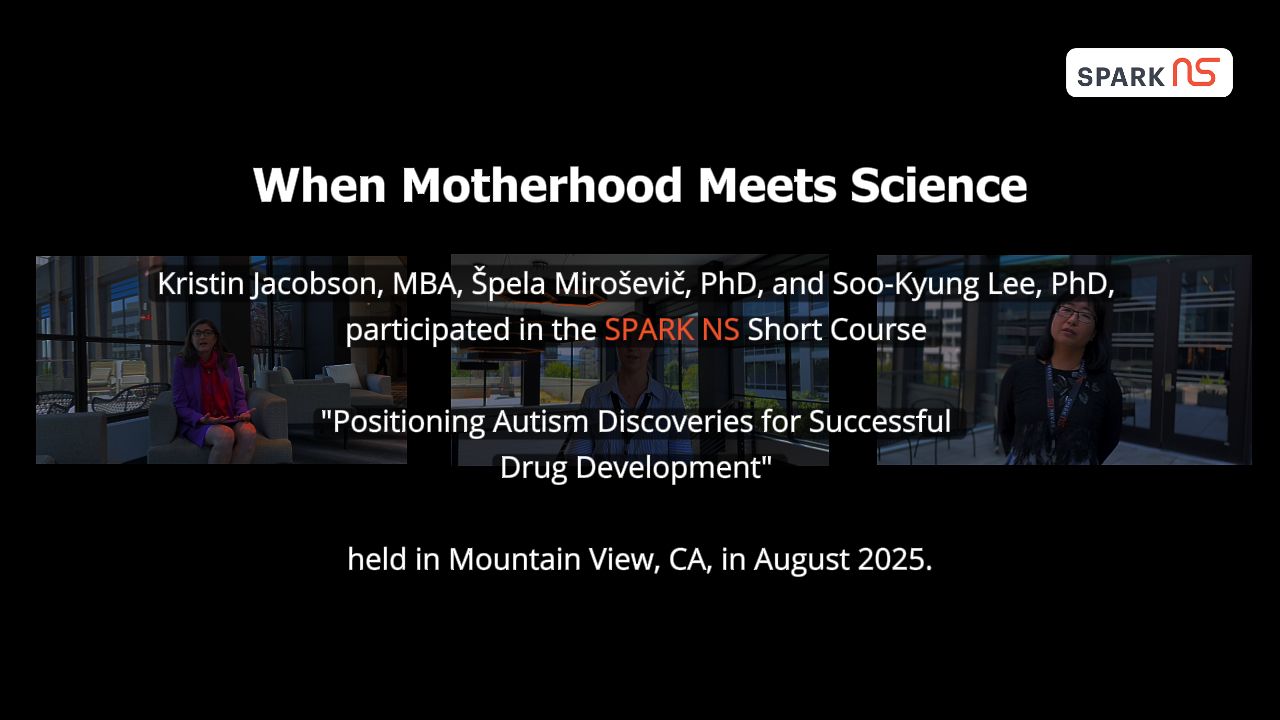 Sometimes knowledge and purpose intersect to drive change where it’s needed most. At a recent SPARK NS short course,”Positioning Autism Discoveries for Successful Drug Development,” attended by 60 researchers from the US, Canada, and Europe, that idea came to life in the stories of three women: Kristin Jacobson, MBA; Špela Miroševič, PhD; and Soo-Kyung Lee, PhD.
